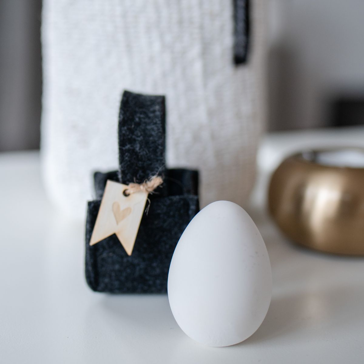 Dieses gegossene Ei kommt in kleiner Filztasche und Holzanhänger daher. Ein super schönes Mitbringsel zu Ostern.